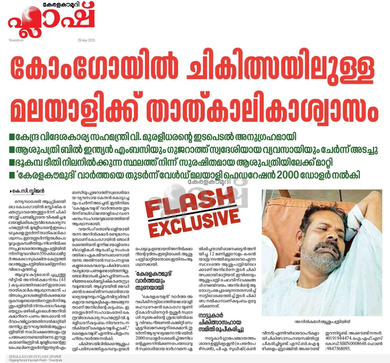 കേരള കൗമുദി വാർത്തയെ തുടർന്ന് വേൾഡ് മലയാളി ഫെഡറേഷൻ 2000 ഡോളർ നൽകി