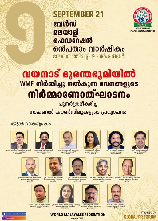 ഒൻപതാം വാർഷിക ദിനത്തിൽ വയനാട്ടിൽ ഉണ്ടായ ഉരുൾപൊട്ടൽ ദുരന്തത്തിൽ വീടും ജീവിതവും നഷ്ടപ്പെട്ടവർക്ക് കരുത്തേകാൻ വേൾഡ് മലയാളി ഫെഡറേഷൻ ഭവനനിർമ്മാണ പദ്ധതി ആരംഭിക്കുന്നു. ദുരിതബാധിത കുടുംബങ്ങൾക്ക് പുതു ഭവനങ്ങൾ നിർമ്മിച്ച് നൽകുക എന്ന മഹത്തായ ലക്ഷ്യത്തോടെ ആരംഭിക്കുന്ന ഈ പദ്ധതി, WMF-ന്റെ സാമൂഹിക പ്രതിബദ്ധതയുടെ തെളിവാണ്.