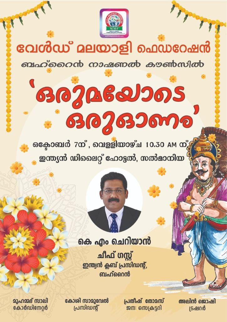 മലയാളികളുടെ ഒത്തൊരുമയുടെയും സൗഹൃദത്തിന്റേയും സമൃദ്ധിയുടെയും മഹോത്സവമായ ഓണം വേൾഡ് മലയാളി ഫെഡറേഷൻ ബഹ്റൈൻ കൗൺസിലിന്റെ ആഭിമുഖ്യത്തിൽ ''ഒരുമയോടെ ഒരുഓണം''എന്നപേരിൽ ഒക്ടോബർ 7th തീയതിയിൽ വെള്ളിയാഴ്ച 10.30am മണി മുതൽ ''ഇന്ത്യൻ ഡിലൈറ്റ് ഹോട്ടൽ സൽമാനിയ''യിൽ വിവിധ കലാ പരിപാടികളോടെ ഓണം ആഘോഷിക്കുന്നു*