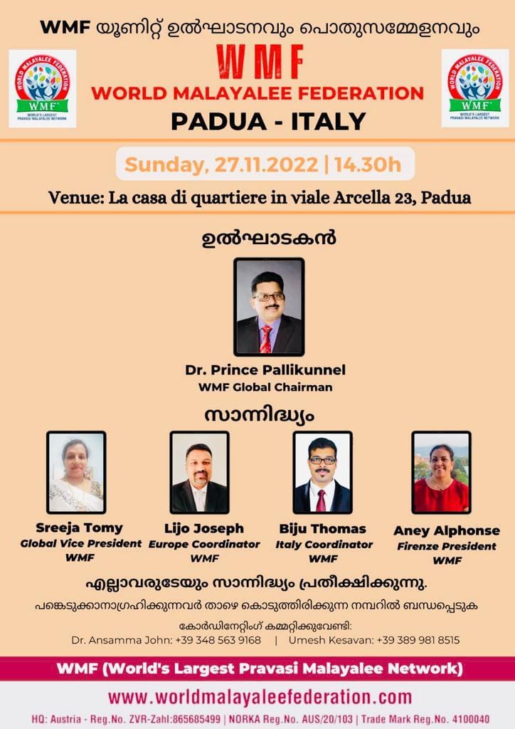 ഈ വരുന്ന ഞായറാഴ്ച 27.11.22 ന് ഇറ്റലിയിലെ നാലാമത്തെ WMF State യൂണിറ്റായ Padua നമ്മുടെ ഗ്ലോബൽ ചെയർമാൻ Dr. പ്രിൻസ് പള്ളിക്കുന്നേൽ ഉൽഘാടനം ചെയ്യുന്നു.